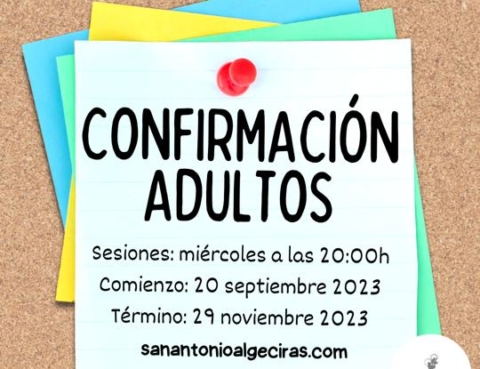 Si eres adulto y no has recibido el Sacramento de la confirmación, todavía estás a tiempo. Sesiones: miércoles, de 20:00h a 21:00h, en :nuestra Parroquia. Comenzamos el 20 de septiembre. Inscripciones: 13 y 14 de septiembre, de 17:00h a 18:30h, en despacho parroquial. ¡¡Te esperamos!!